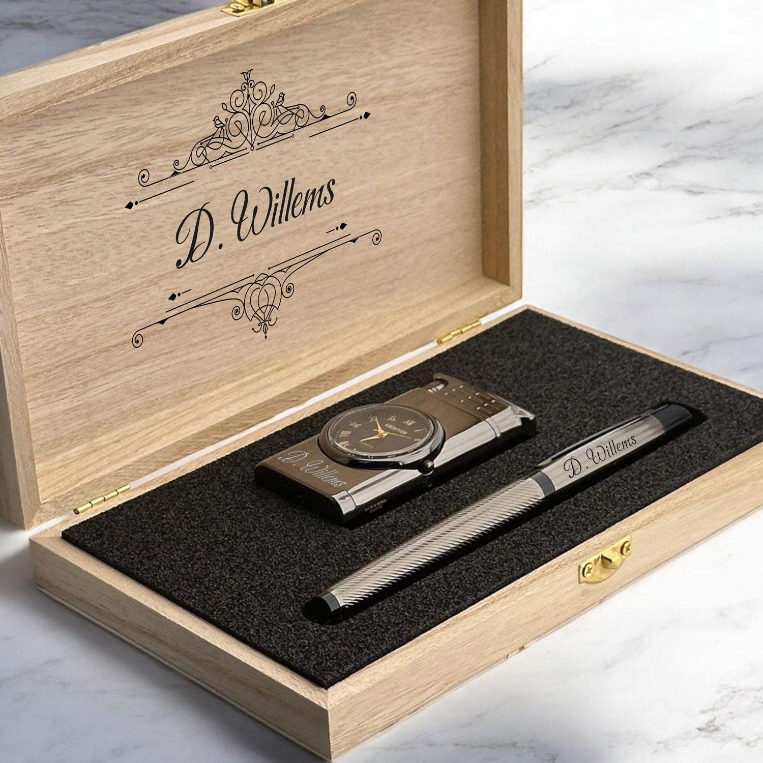 Personally Engraved Lighter with Watch and Ballpoint Pen Gift Set - In Wooden Box D2