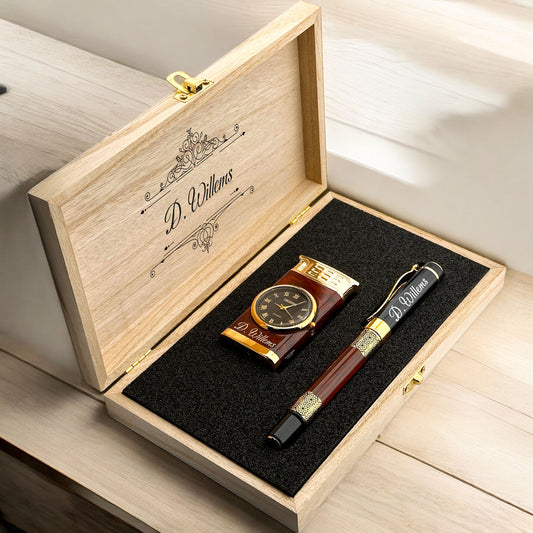 Personally Engraved Lighter with Watch and Ballpoint Pen Gift Set - In Wooden Box D2