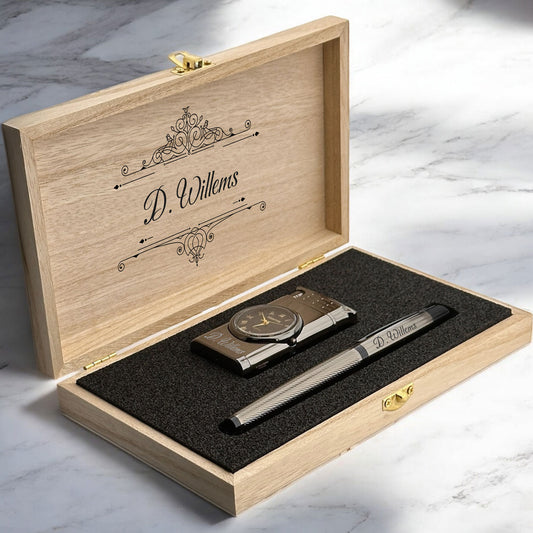 Personally engraved lighter with watch and rollerpen gift set - in wooden box D1