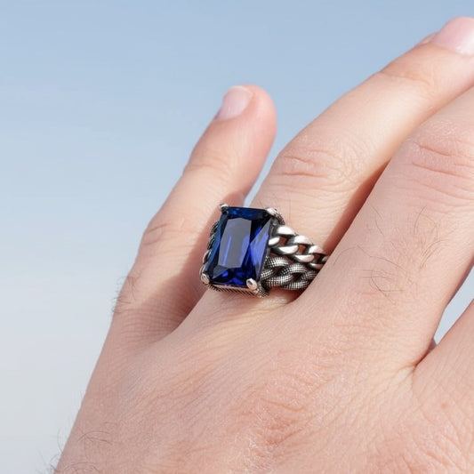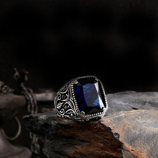 Silver men's ring with blue stone
