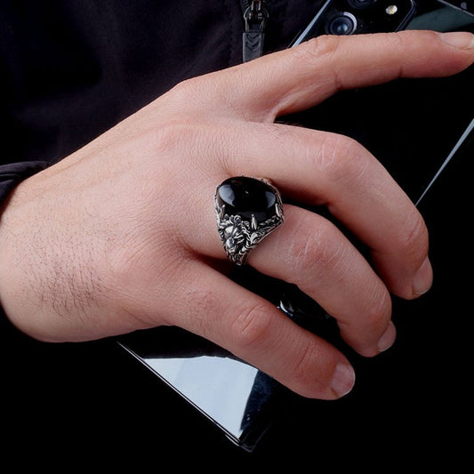 925 Silver Men's Ring with Eagle Motif and Black Stone