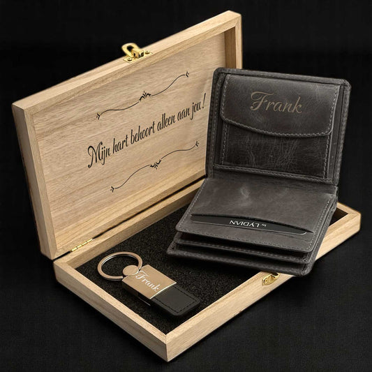 Luxury Gift Set: Leather Wallet, Watch Lighter in Wooden Box - Customizable