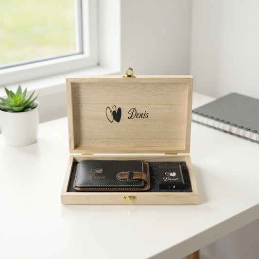 Luxury Gift Set with Personal Text Box, Leather Wallet & Lighter