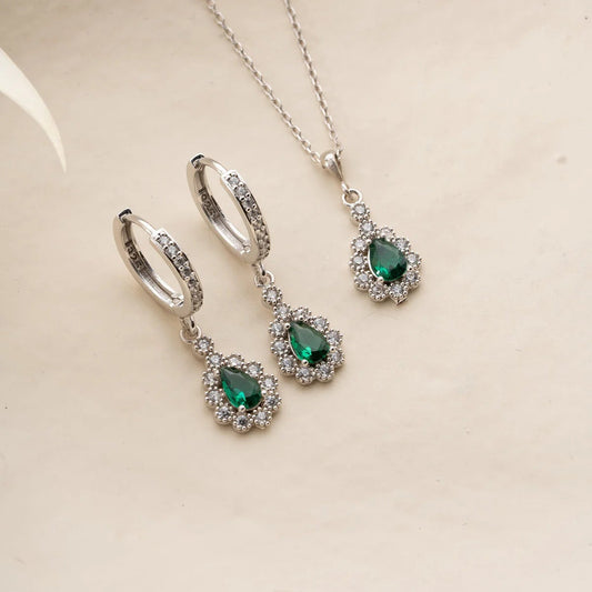 Emerald Elegance – 925 Sterling Silver Earrings & Chain Set