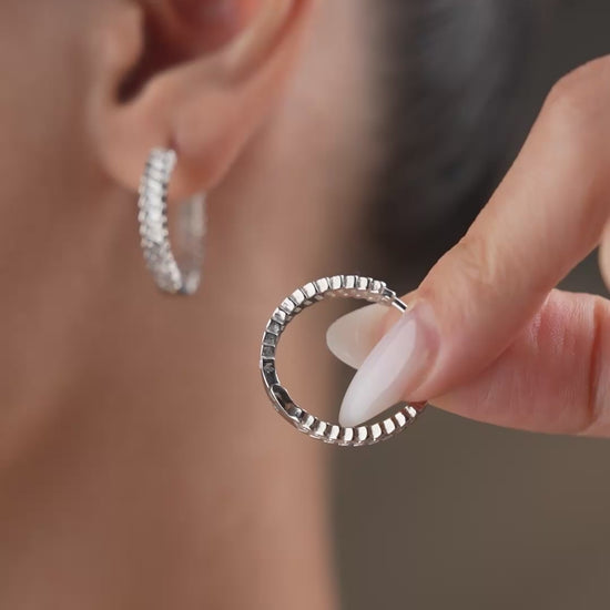 Glanzende hoepeloorbellen van 925 zilver met baguette geslepen stenen.