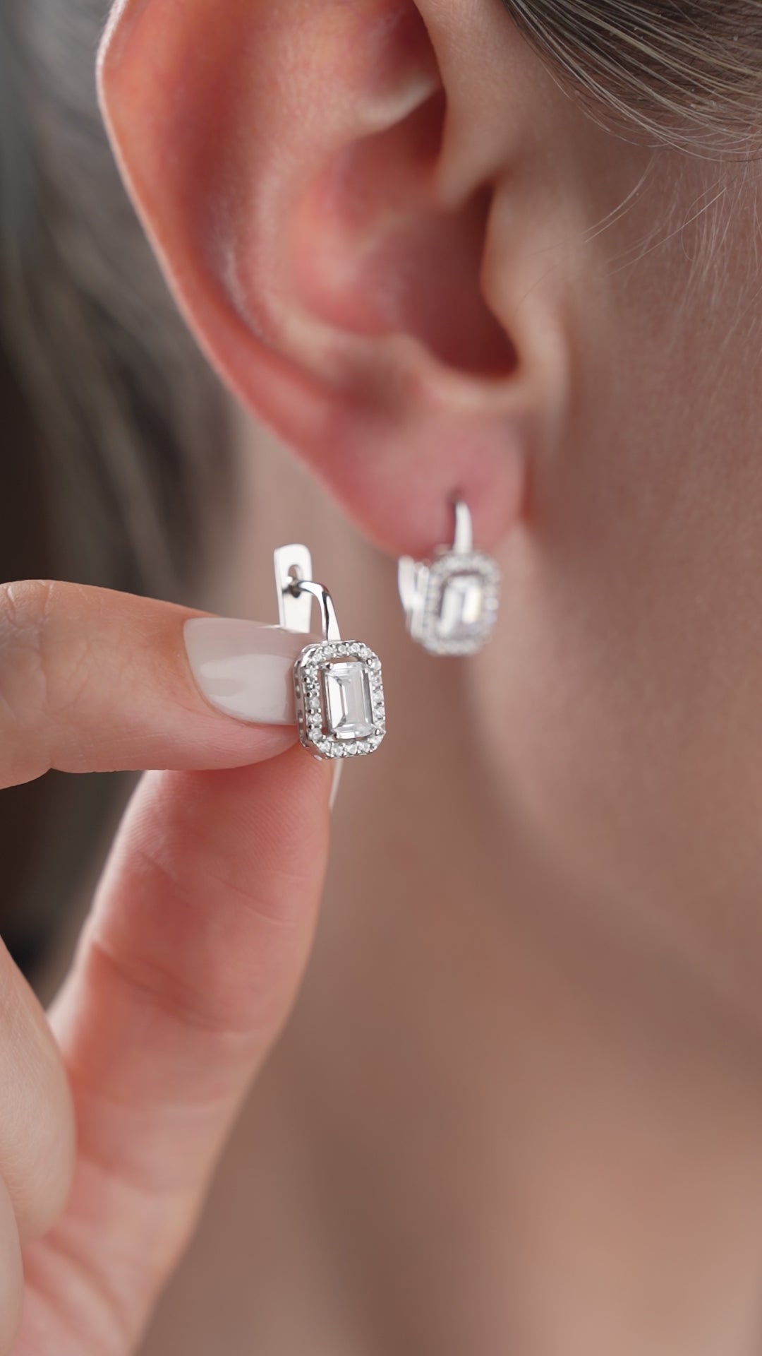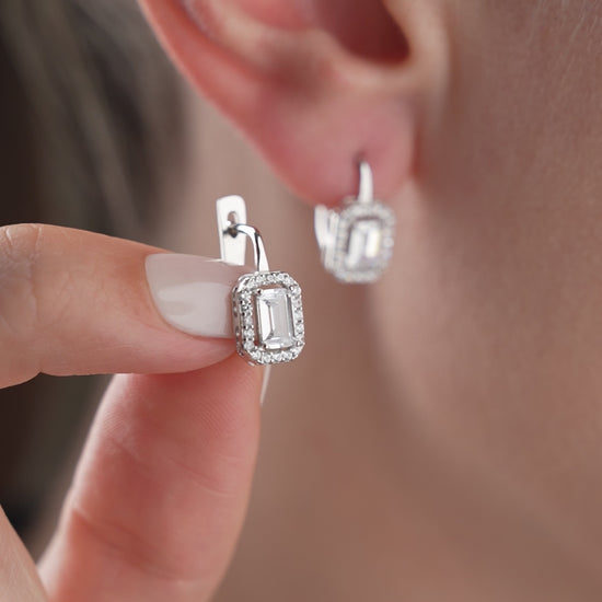 Crafted from 925 sterling silver, these elegant earrings feature a baguette-cut center stone surrounded by sparkling stones. A stylish choice for both everyday wear and special occasions.
