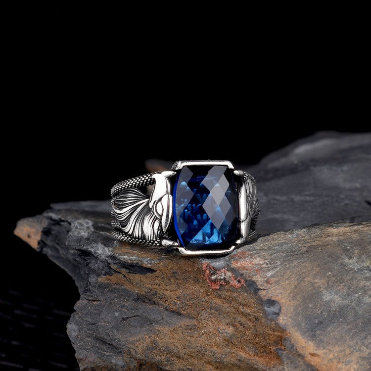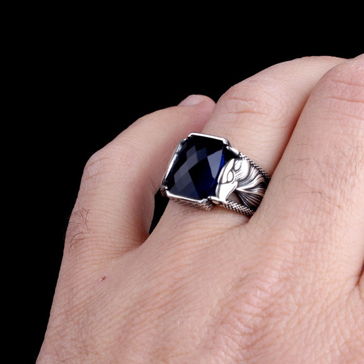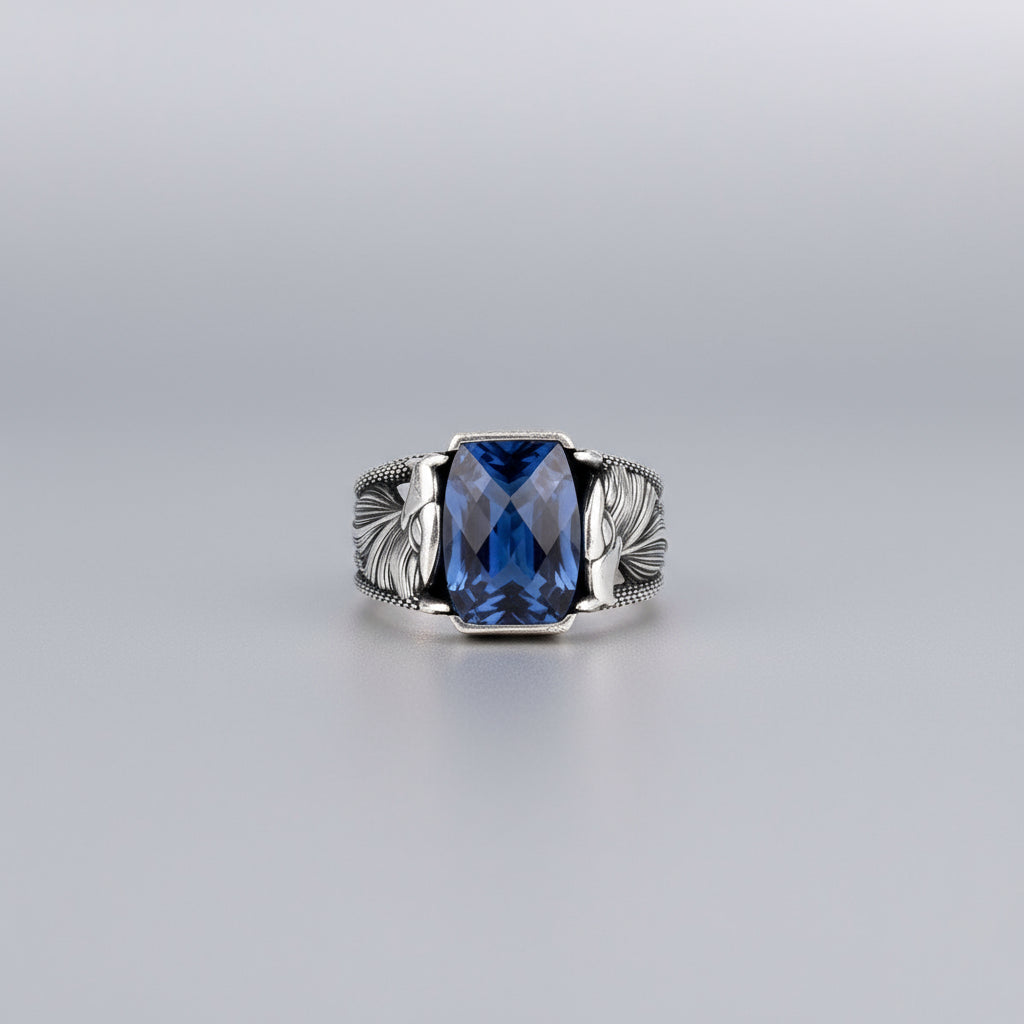 Stoere herenring van 925 sterling zilver met een grote blauwe steen en gedetailleerde adelaar aan de zijkanten.