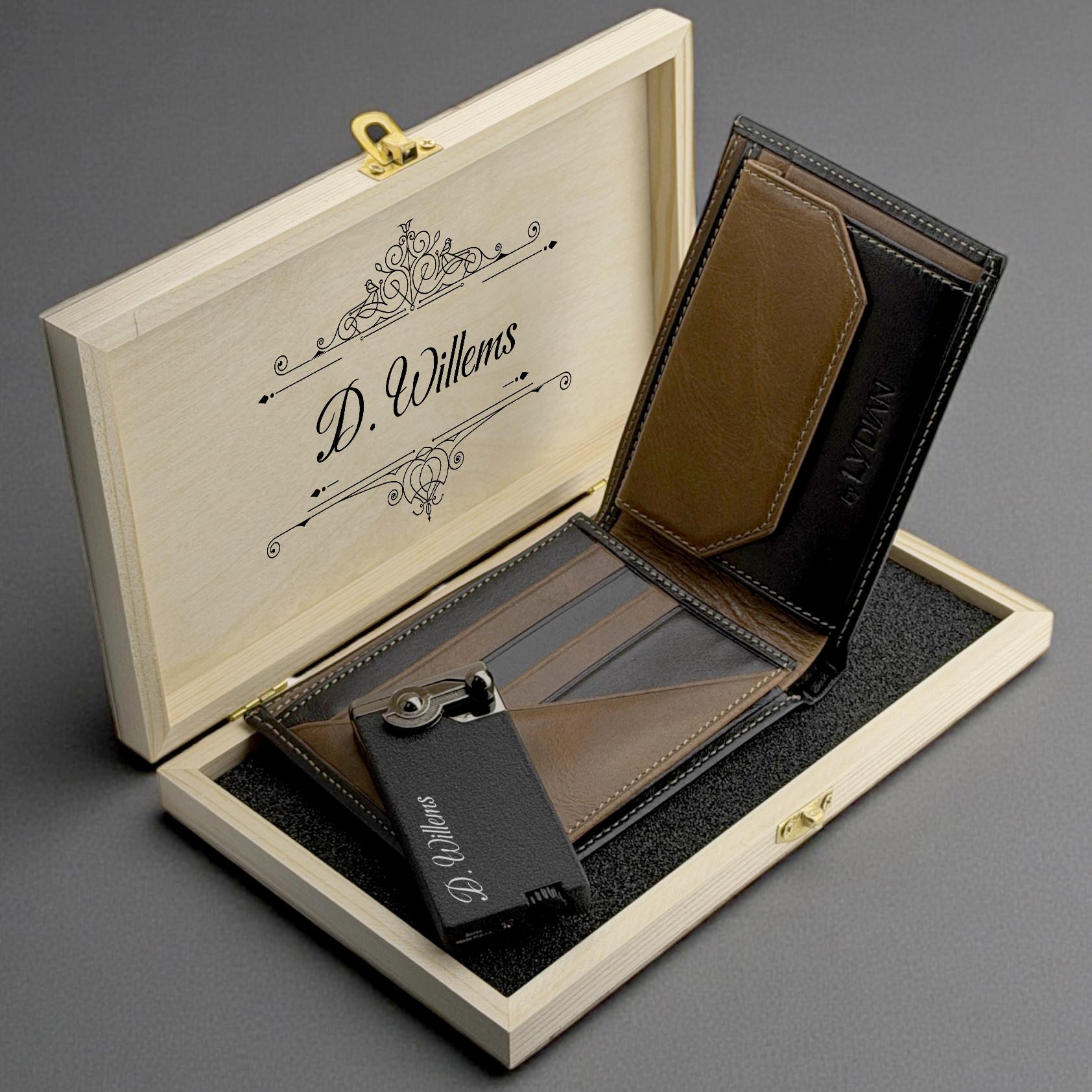 Luxurious wooden box with leather wallet and metal lighter – personalized with name, perfect as a gift.
