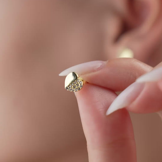 Small heart-shaped stud earrings with shiny and stone-encrusted half.