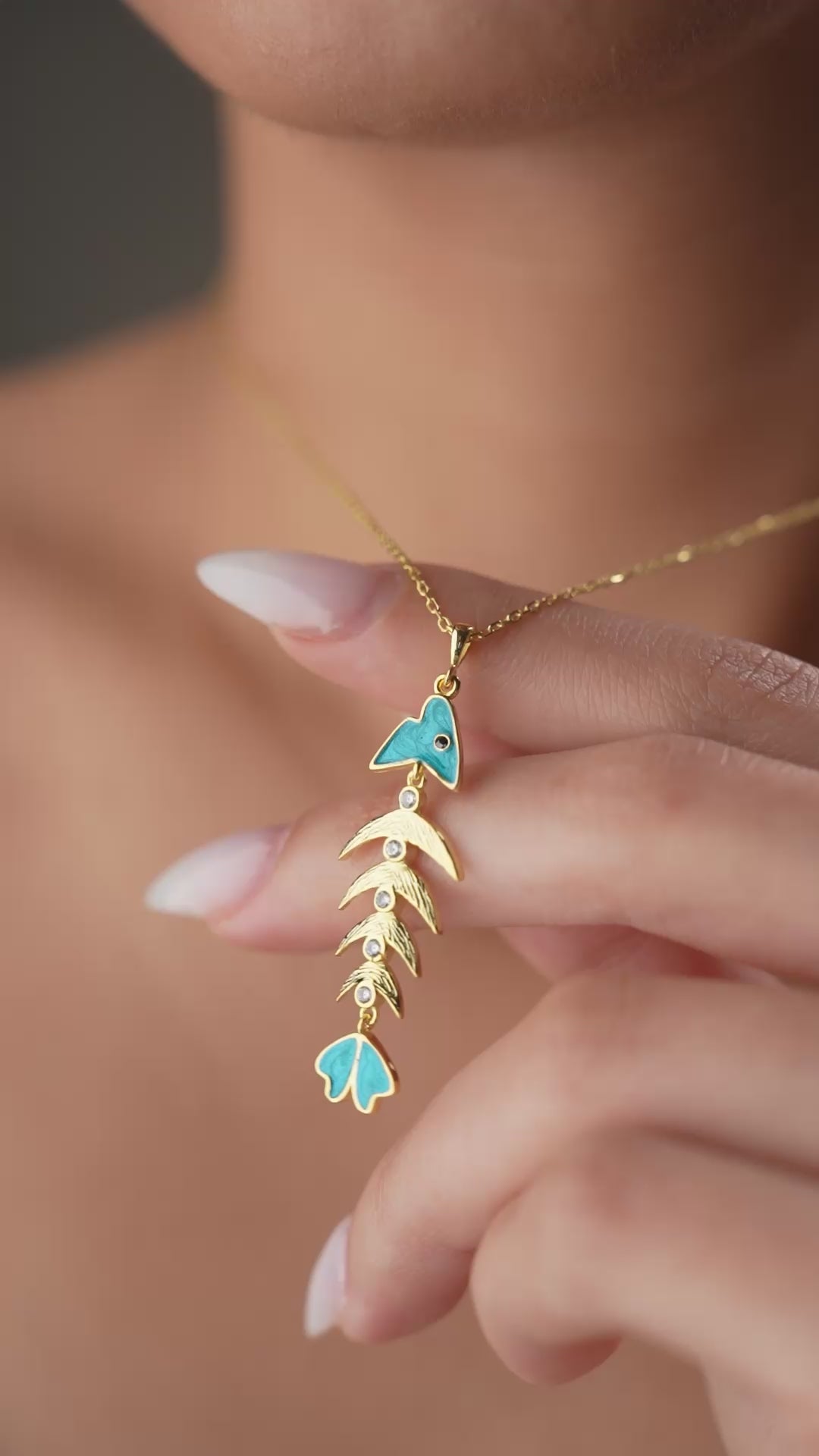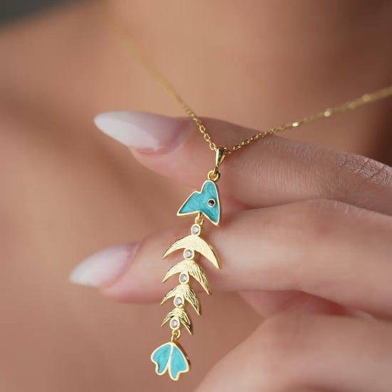 Gold-colored necklace with turquoise enamel and zirconia in a playful herringbone design.