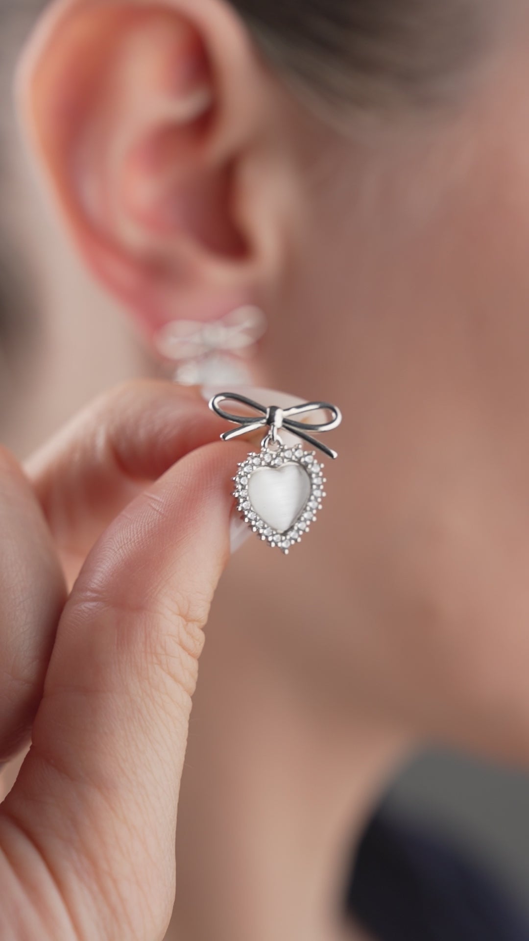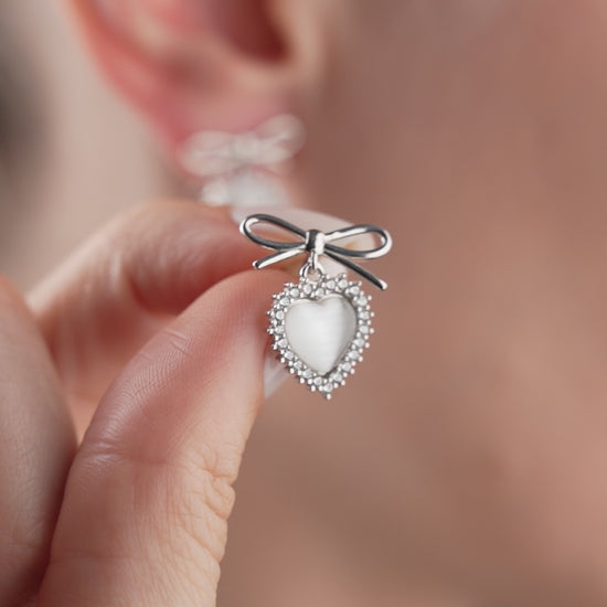 These charming earrings combine an elegant bow with a sparkling heart-shaped stone. Perfect for a romantic, feminine look. The silver color makes them easy to pair with any outfit – ideal for both everyday wear and special occasions.