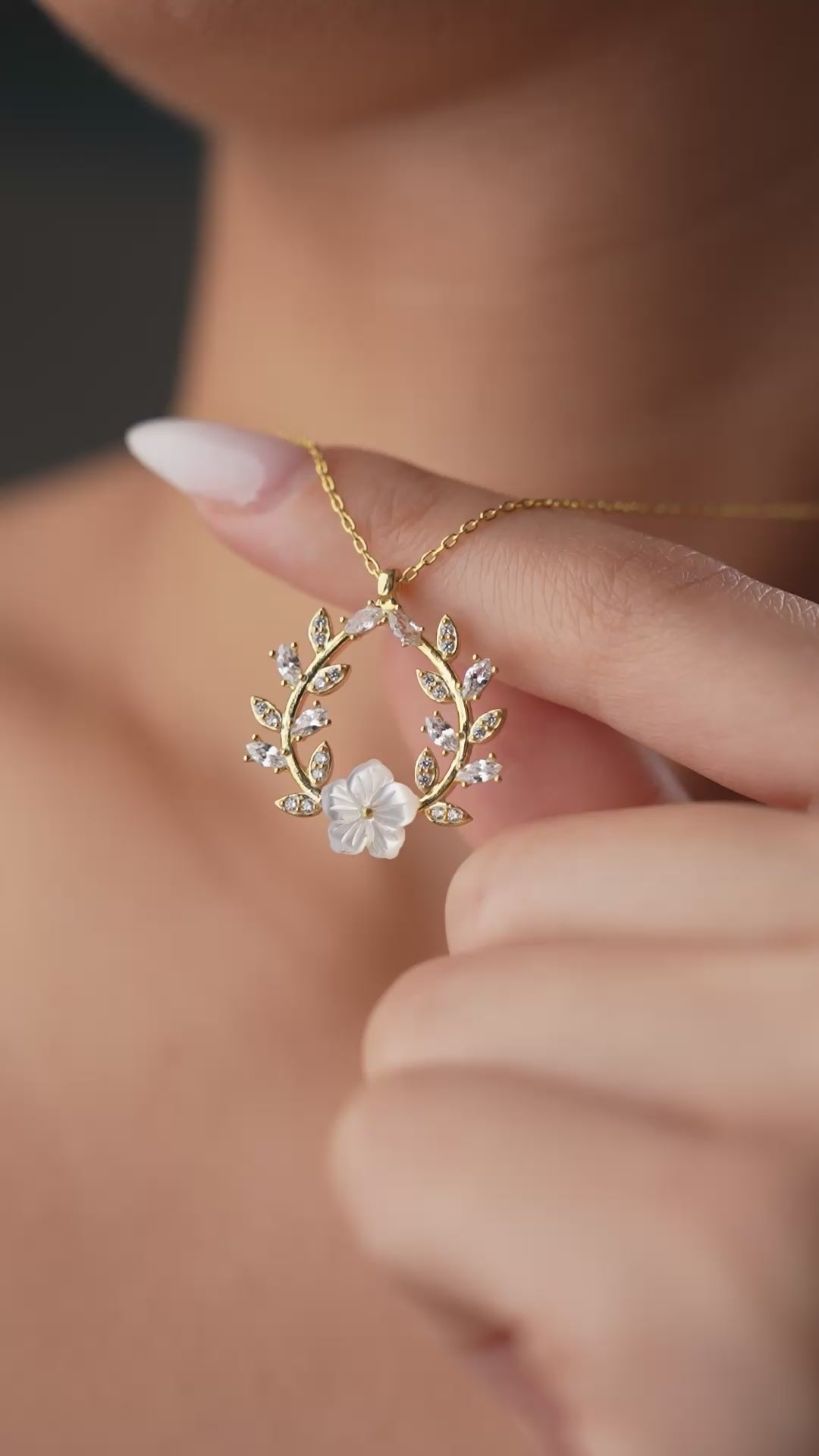 Elegant necklace with white flower and zirconia leaves in gold-colored design.