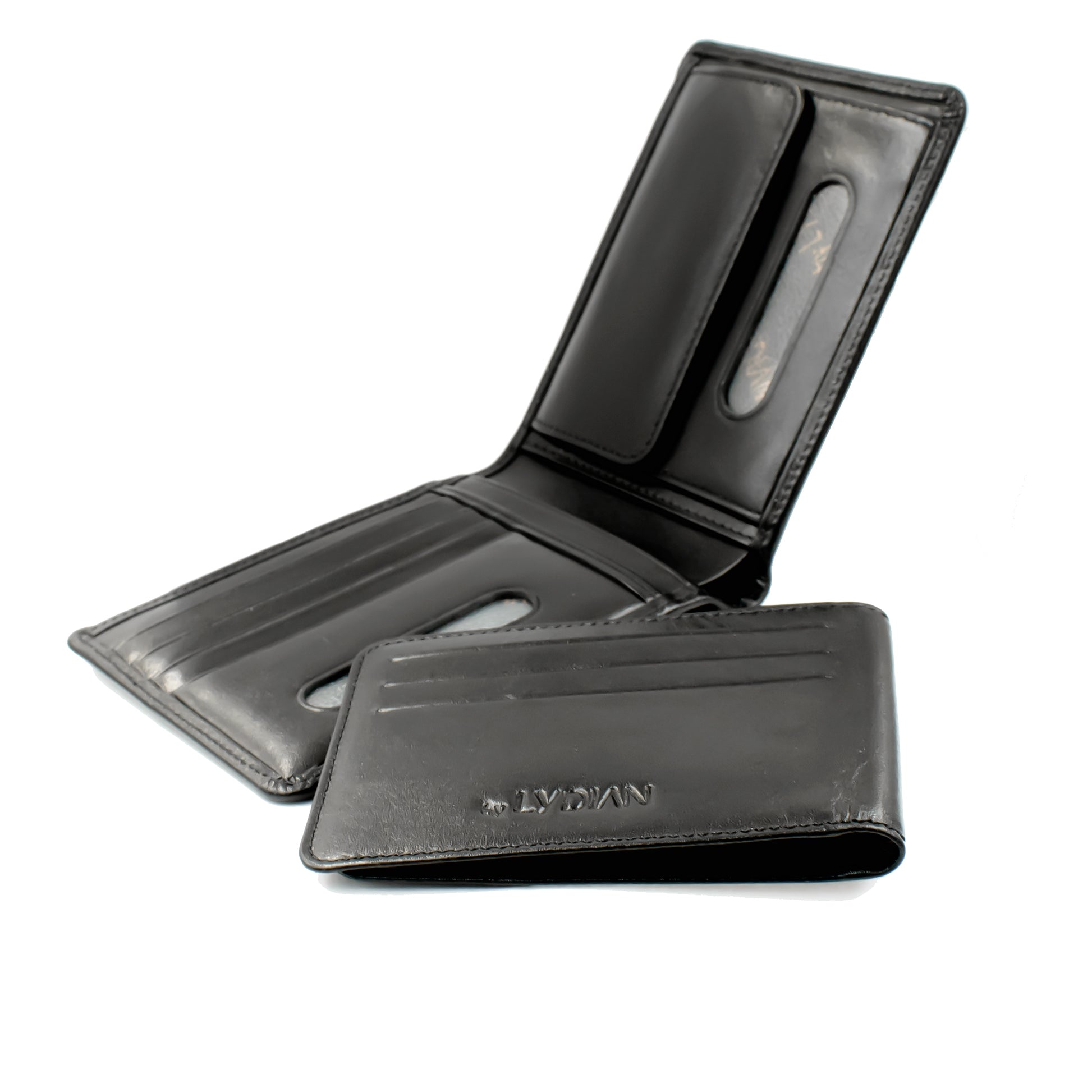 Luxurious black leather wallet with a personalized name engraving and a wooden gift box with an engraved message.